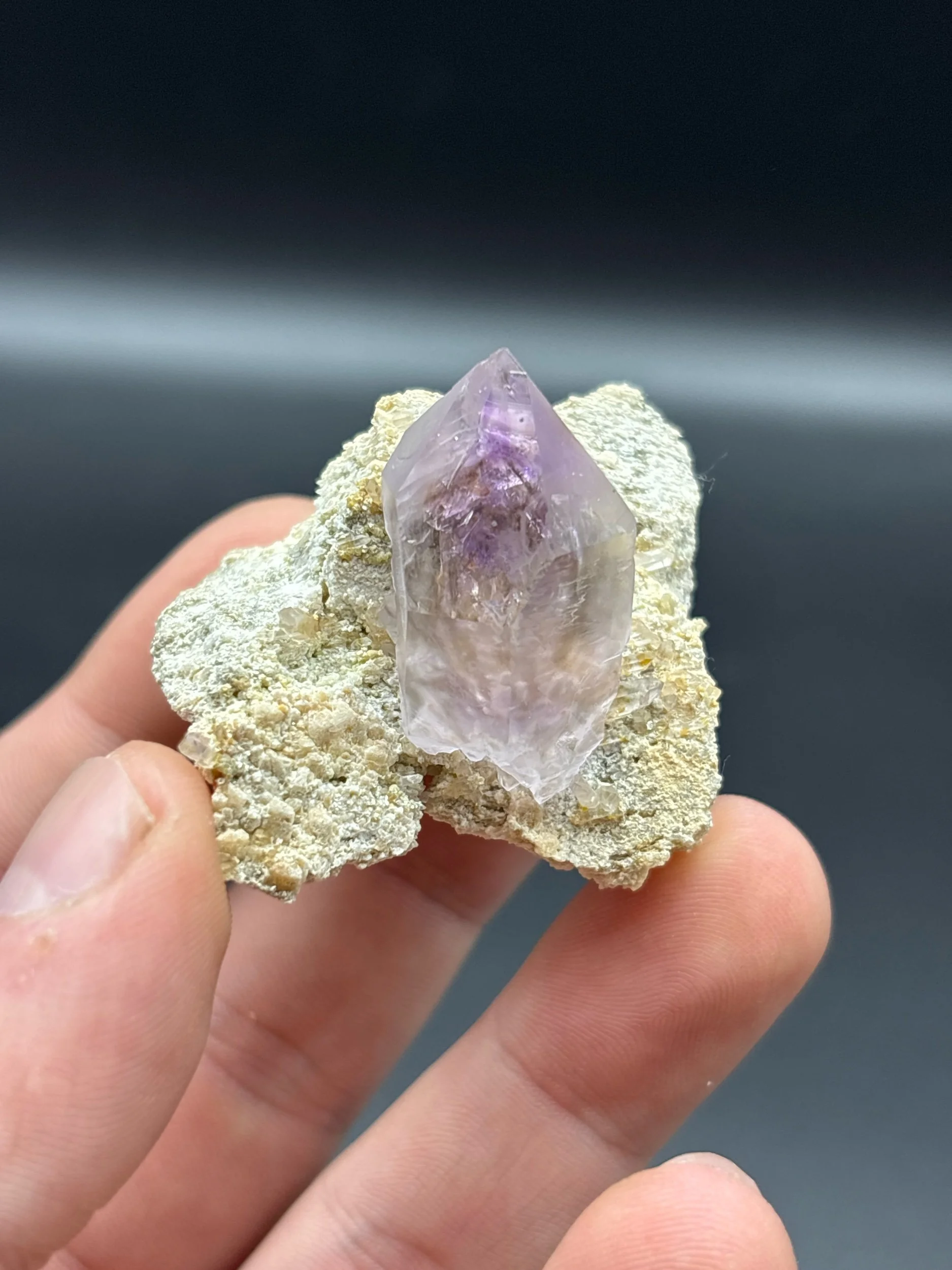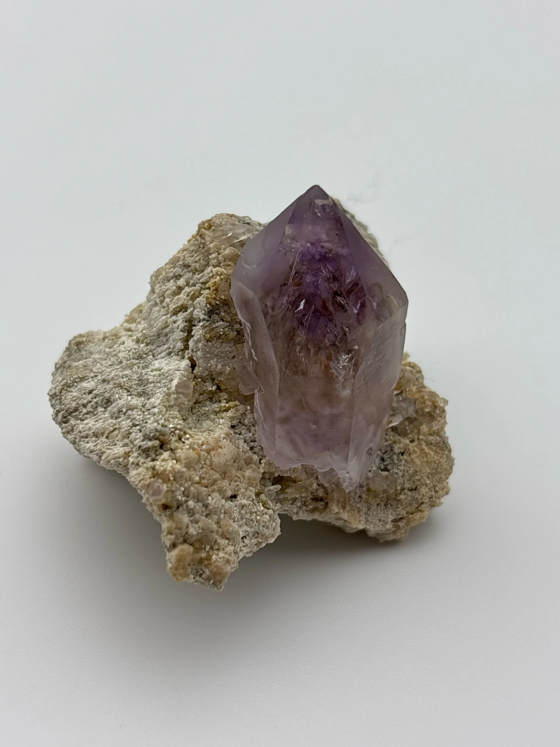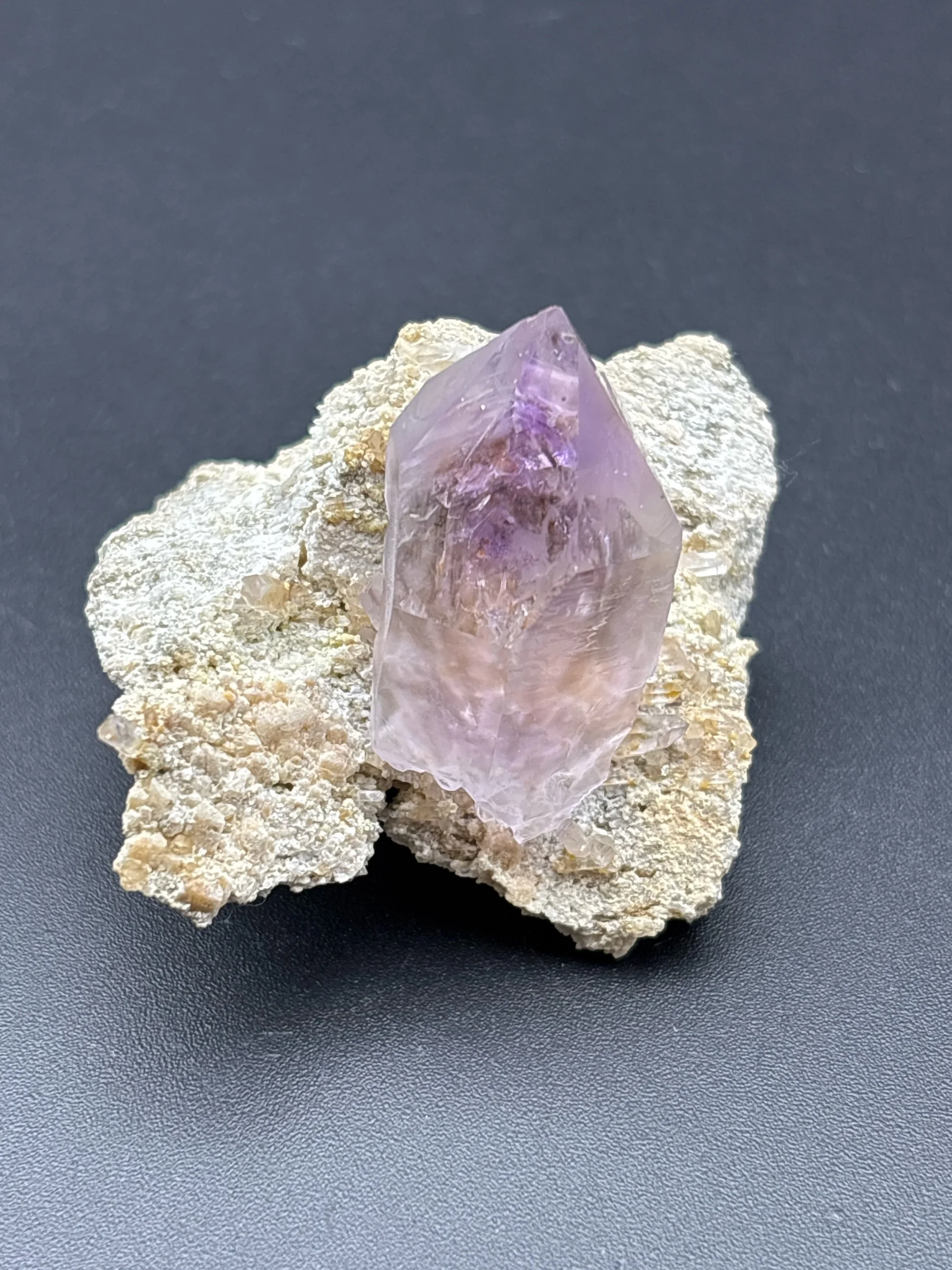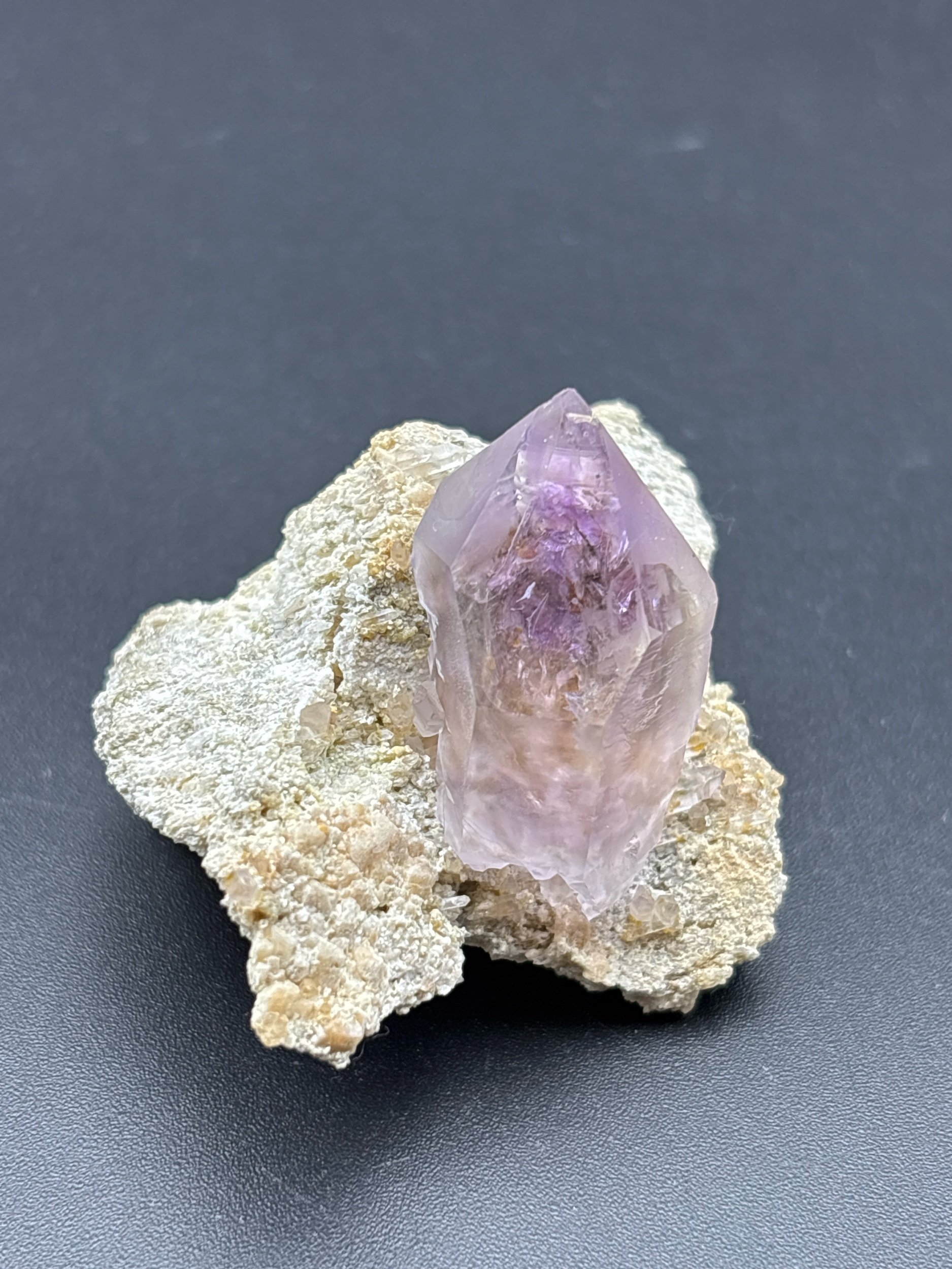 This specimen is a beautiful miniature example of etched microcline with amethyst, harvested in the 2025 season. The amethyst is nicelyy isolated and display no issues. The etched micocline is accented by pale green glittery sericite mica, an alteration mineral present throughout the mine. Overall, the aesthetics of this specimen are astounding for a miniature. It also displays excellent brazil-law twinning!!!