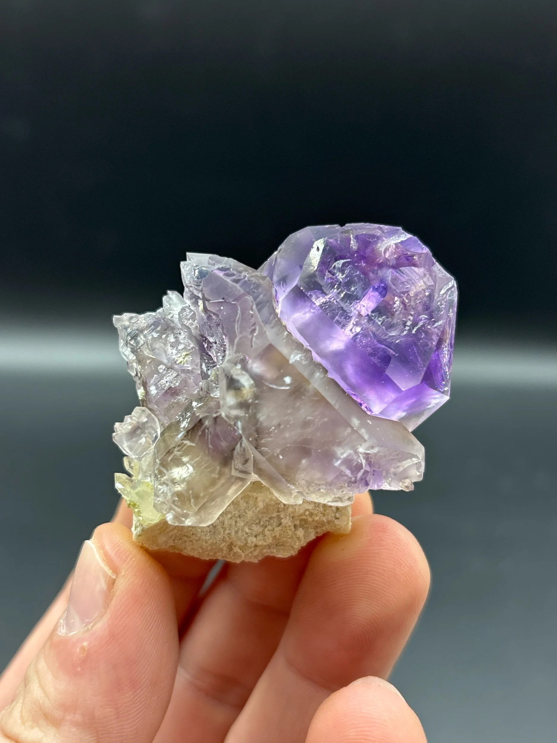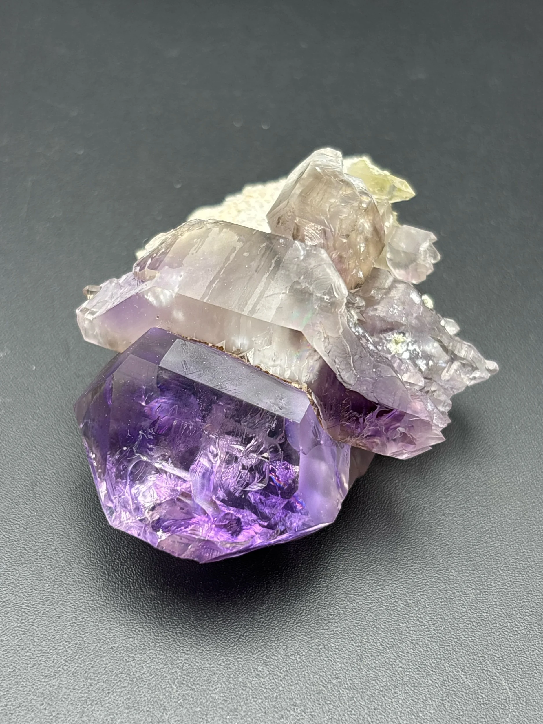This specimen is a beautiful miniature example of etched microcline with a protruding epitaxial quartz capped by amethyst, harvested in the 2025 season. It exhibits excellent luster and vivid color in the main crystal. Micro pyrite inclusions are present in the face of the crystal, visible with loupe. The etched microcline is accented by pale green sericite mica, an alteration mineral present throughout the mine.