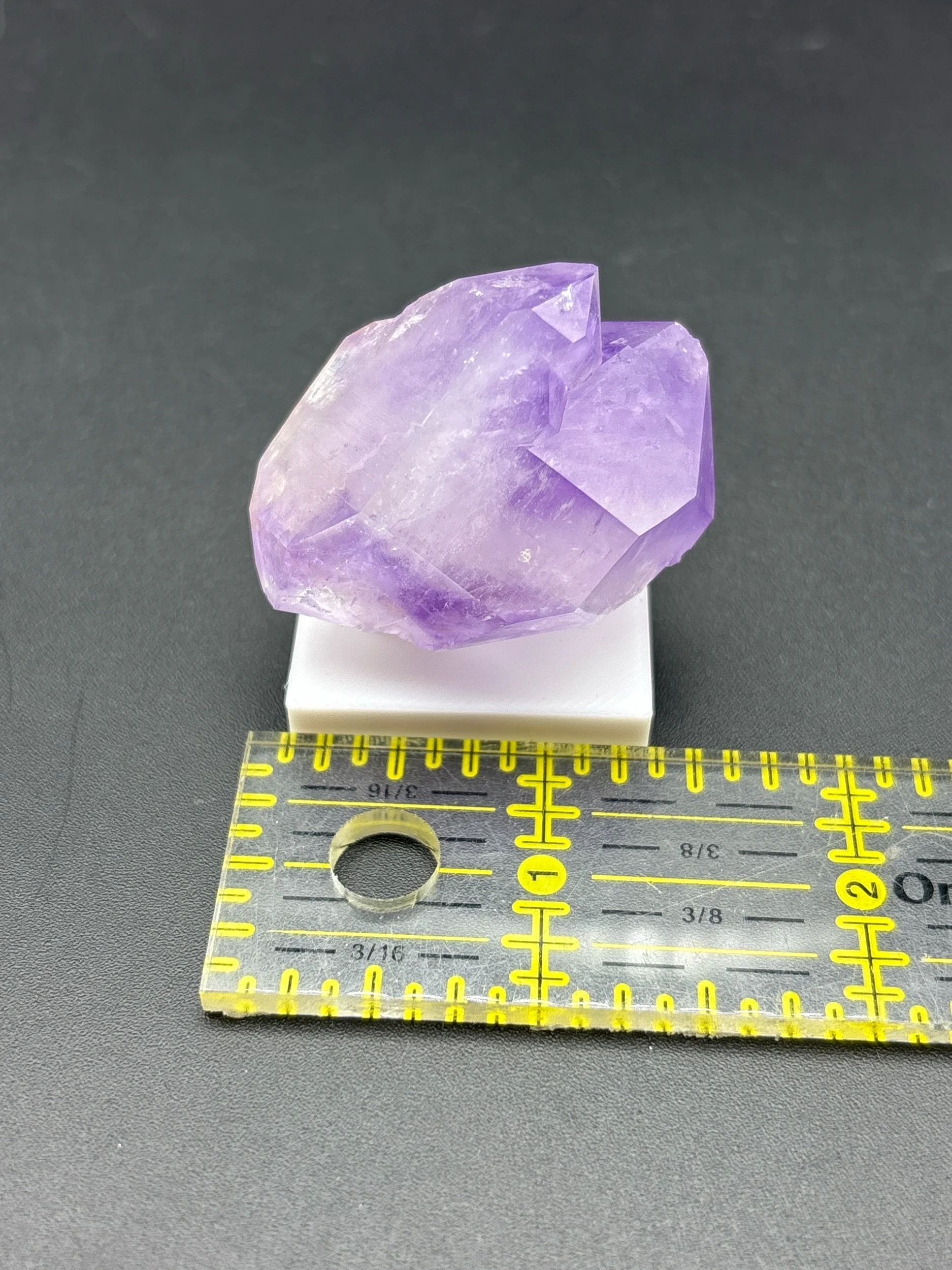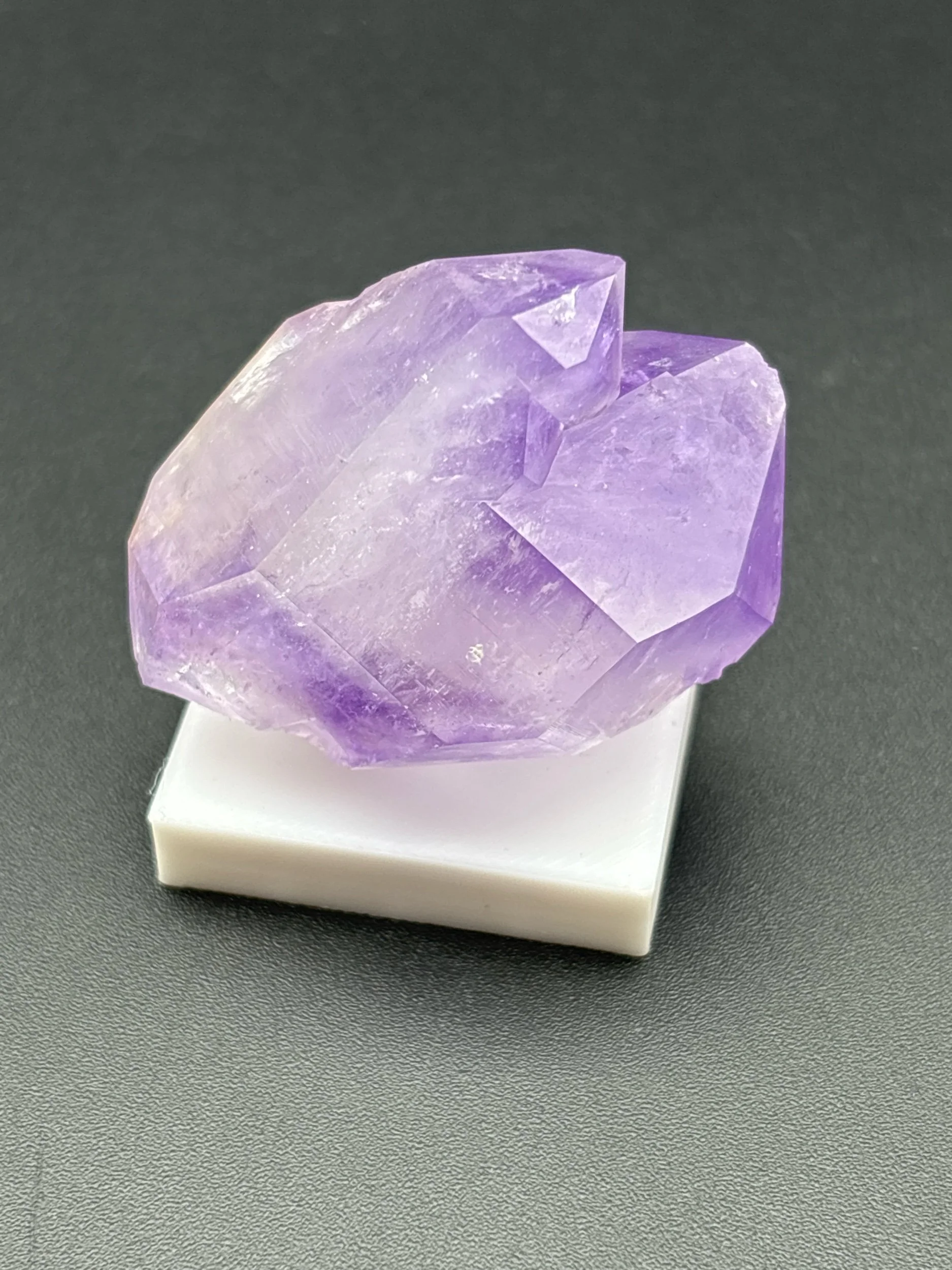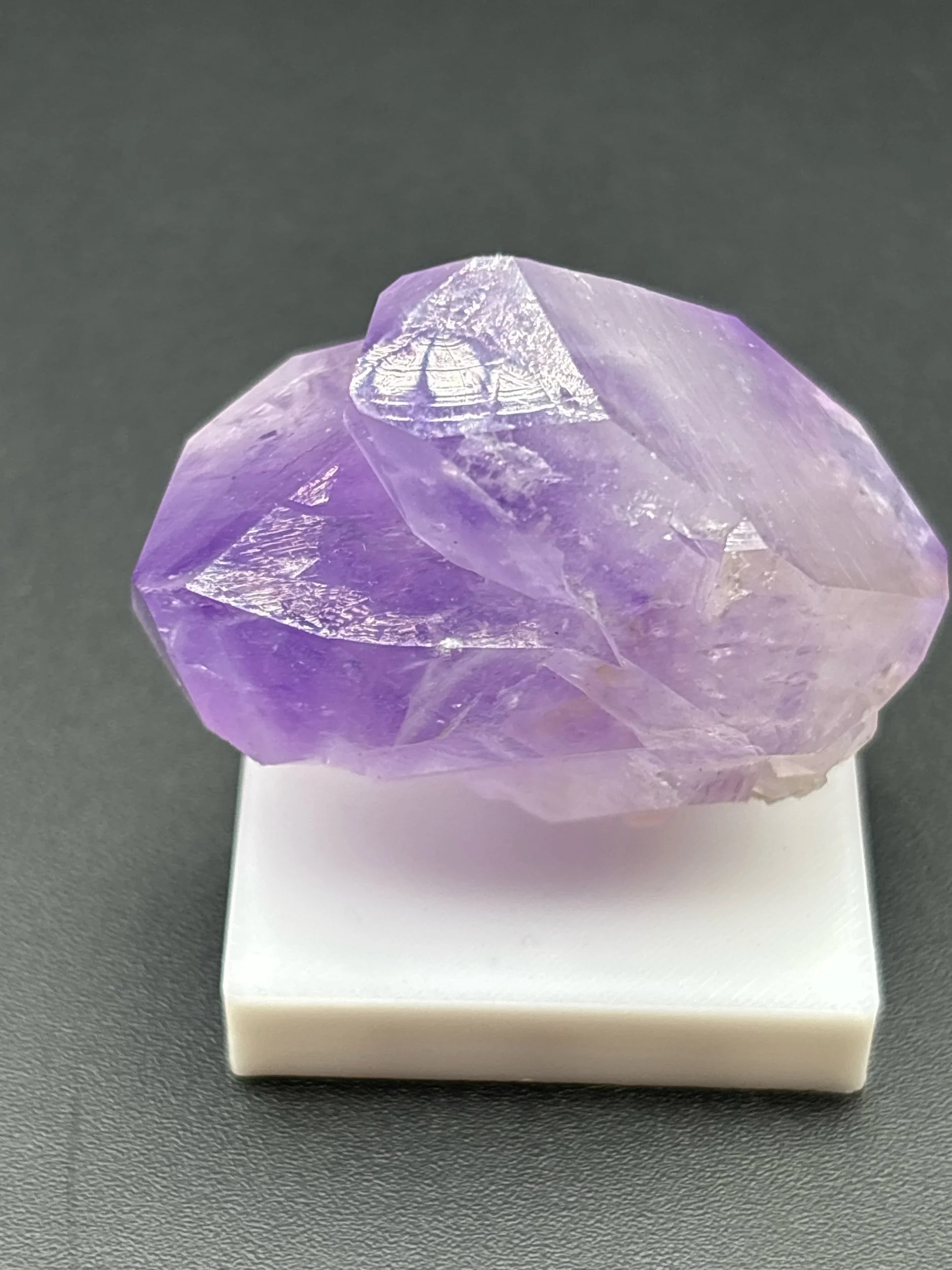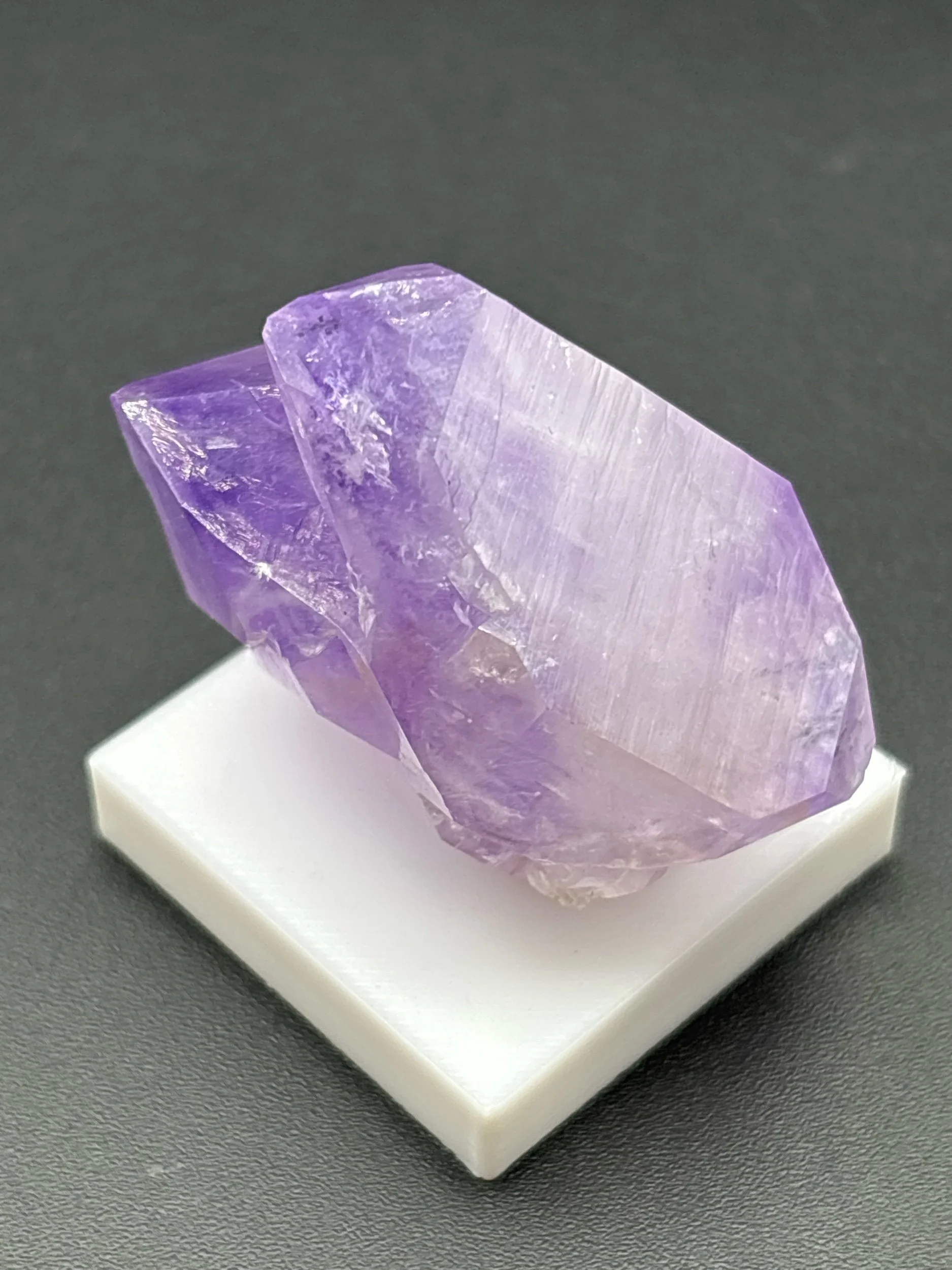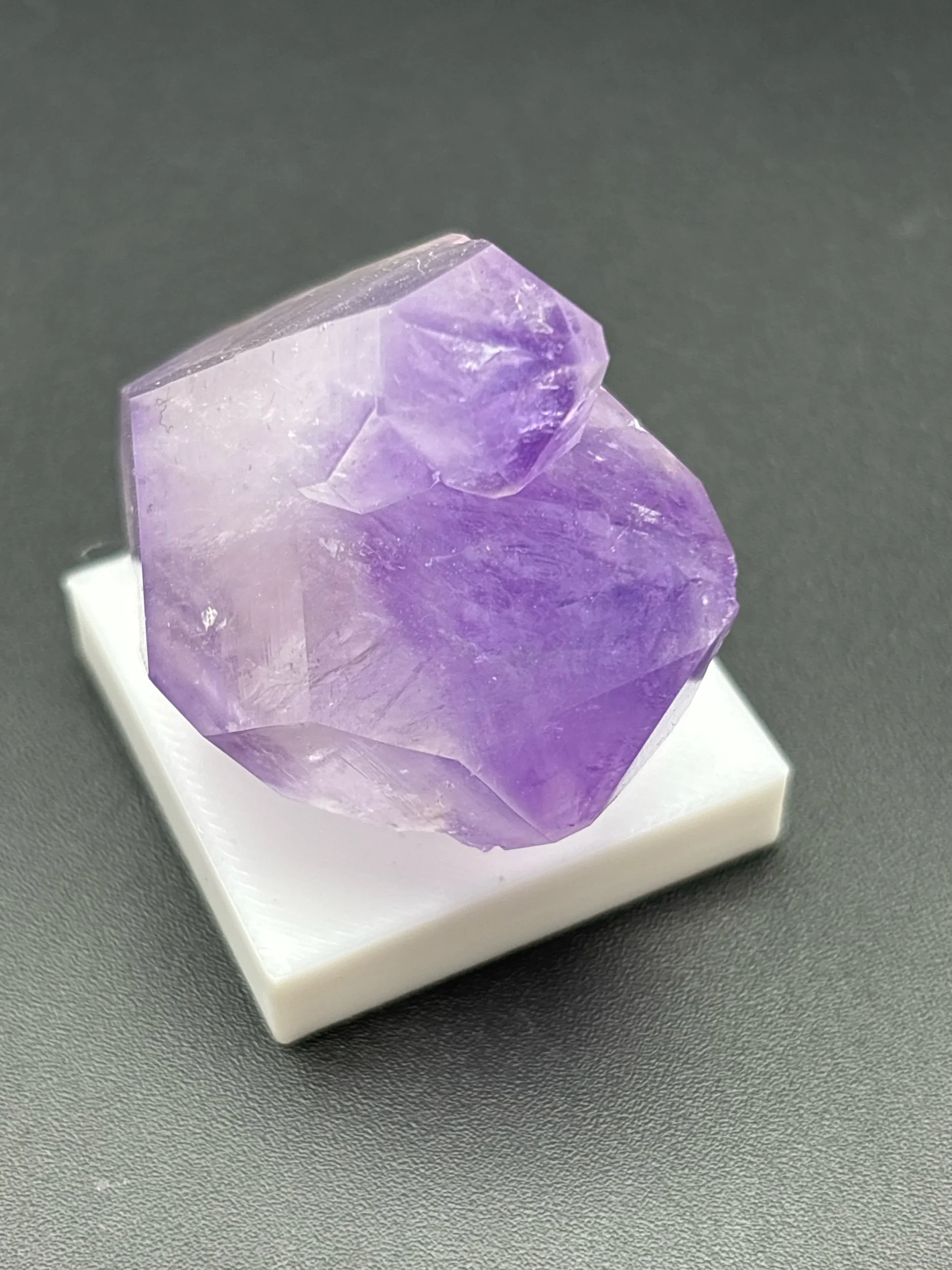 This is a richly colored single crystal of amethyst displaying zoning in both terminations. Detatched from matrix, this crystal stands alone proudly. Non-permanently affixed to white 3D printed base. Ex Persson Rare Minerals.
