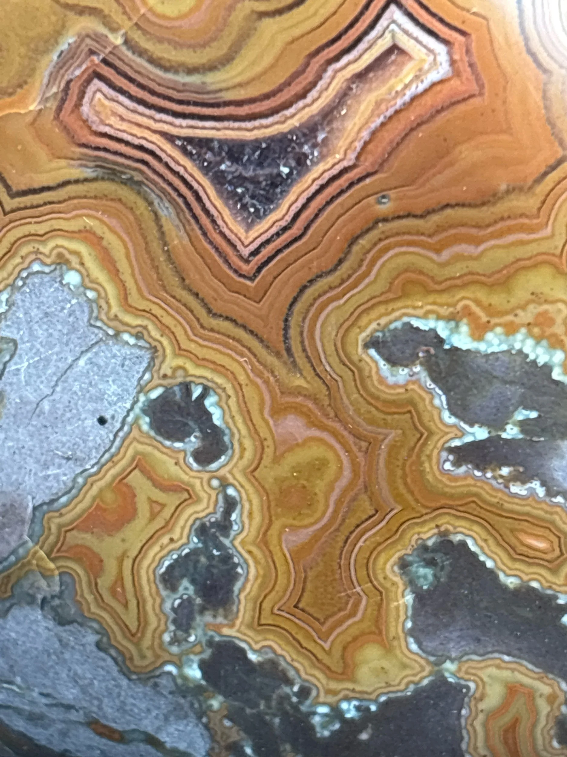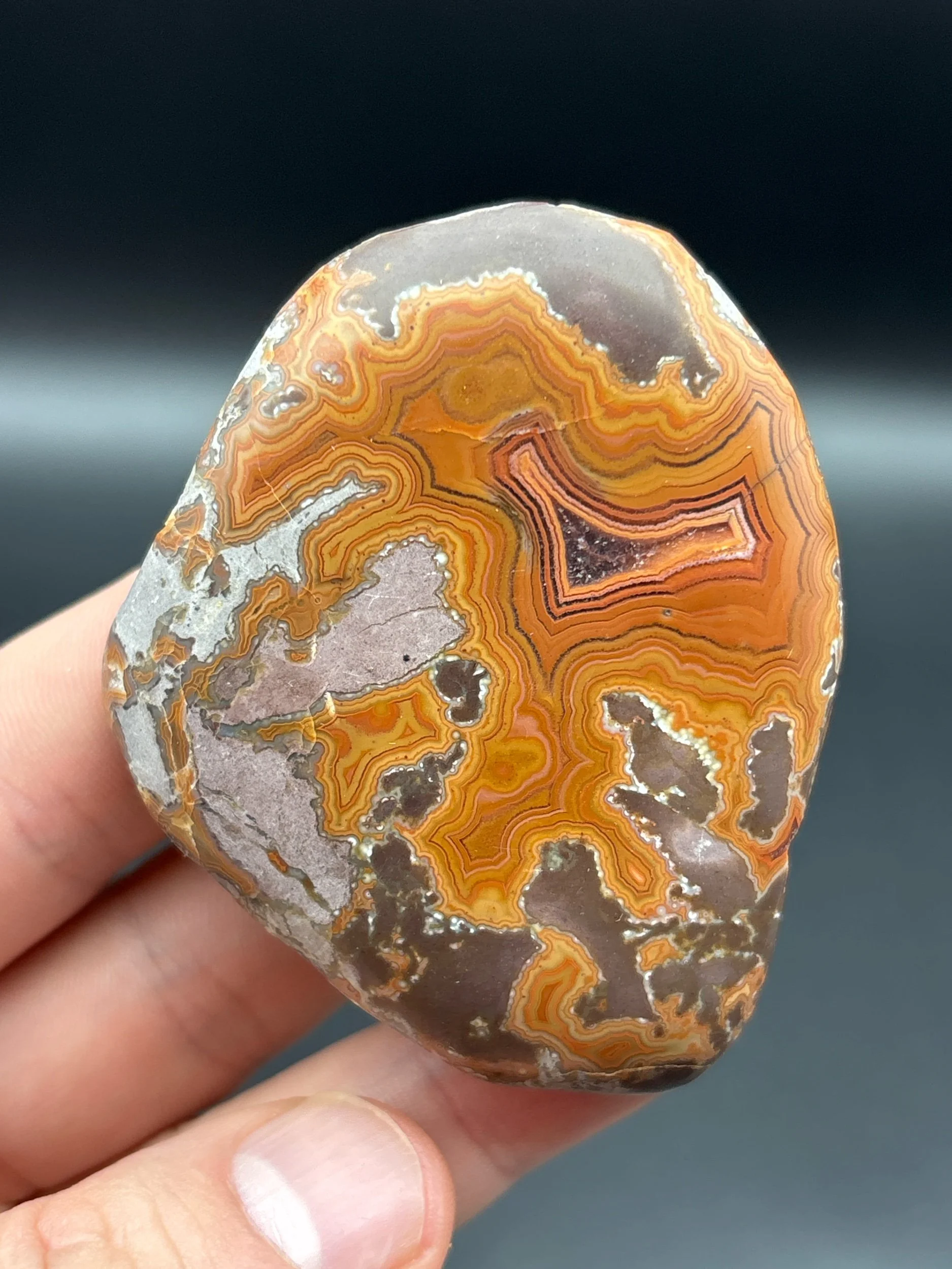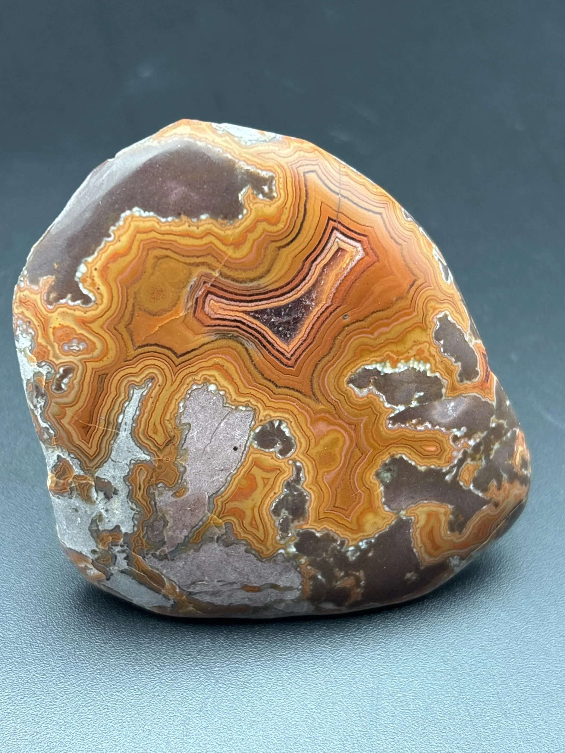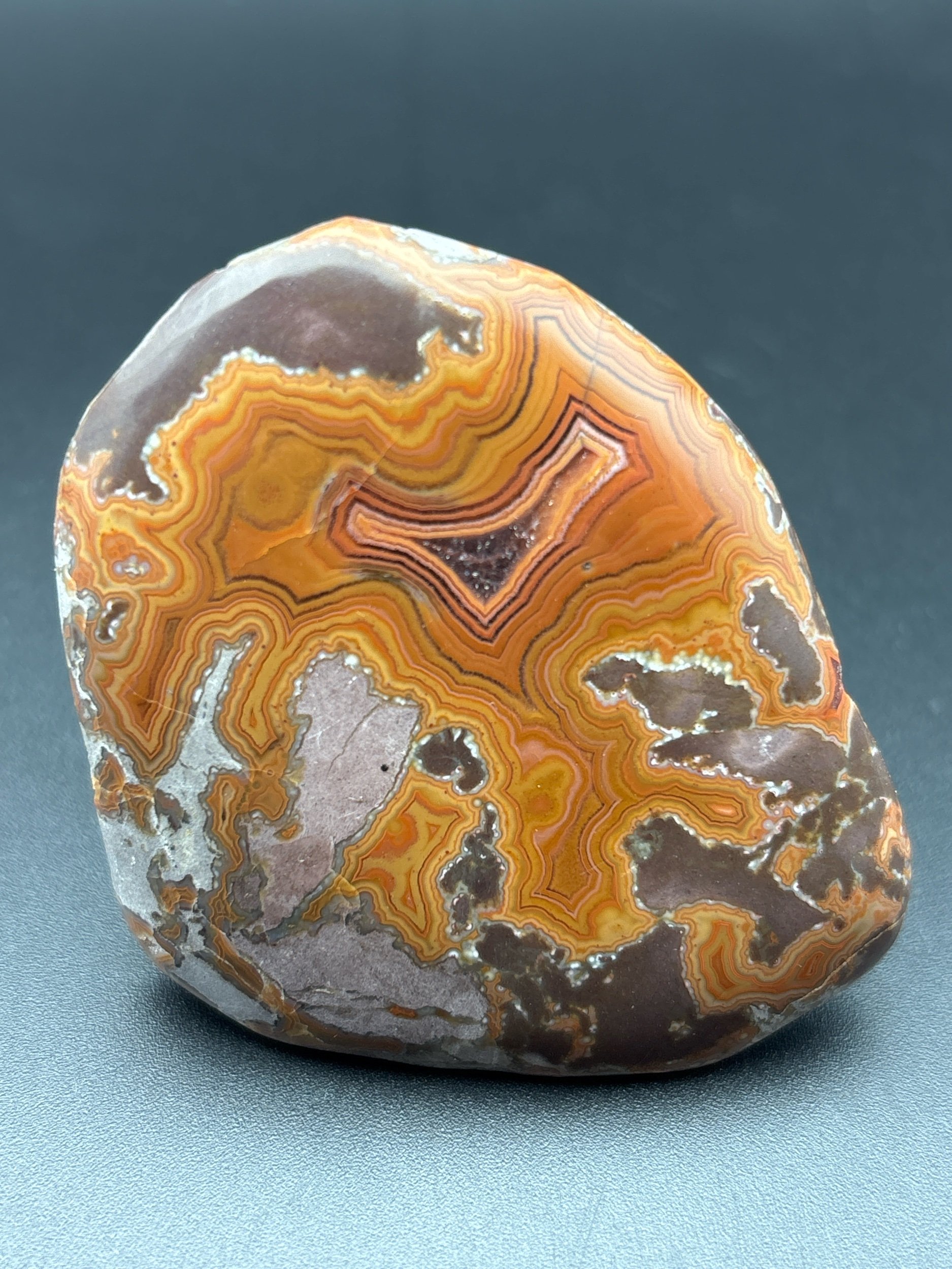 This specimen is a classic example of face-polished Dryhead agate with intense orange banding. Not automatically polished, the gently domed edges reveal this piece to be handwork, a show of more love and attention. This nodule has almost no excess matrix, despite a natural back, which is of utmost desirability! This specimen comes from 2025 production. UV is shortwave reaction (254nm)