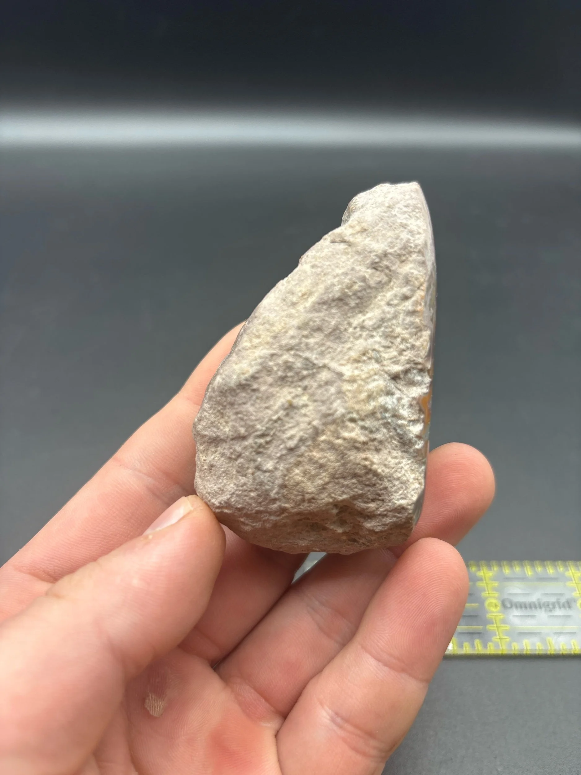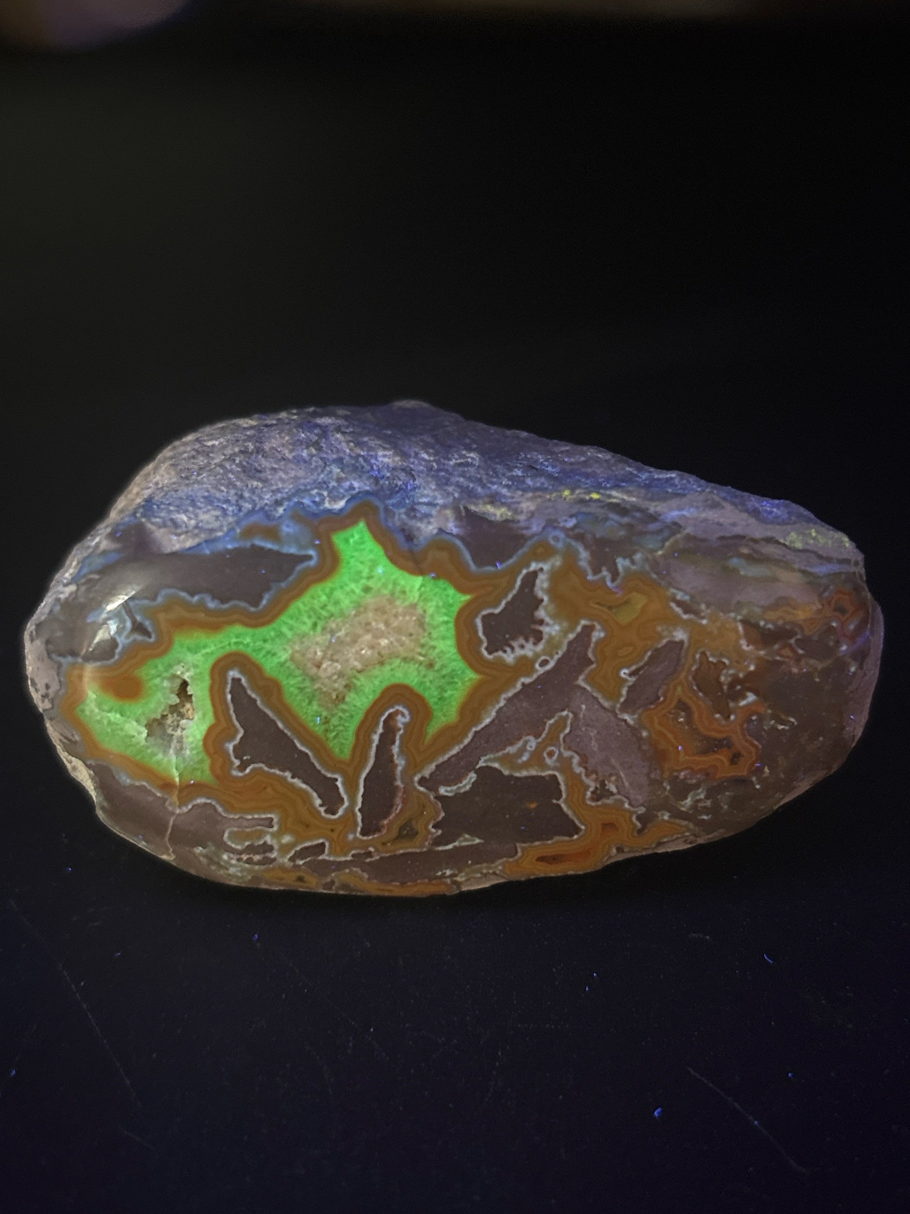 This specimen is a classic example of face-polished Dryhead agate with intense orange banding. Not automatically polished, the gently domed edges reveal this piece to be handwork, a show of more love and attention. This nodule has some excess matrix, which could be worked further to reveal more pattern! This specimen comes from 2025 production. UV is shortwave reaction (254nm)