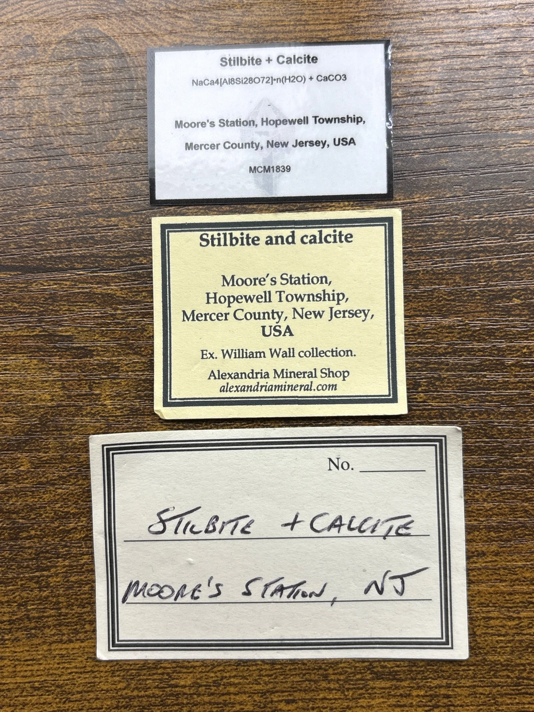 There is longstanding confusion between this locality and “Moore” a site along Rt. 29, very near the Delaware River and the northwestern end of Baldpate Mountain, approximately 3.7 airline miles west – southwest of the Moore’s Station on the Reading (Conrail) Railroad. The 1887 map, cited above, calls the place near the river “Moores”. The USGS topographic map calls it “Moore” but the road map published by Hagstrom calls it Moore’s Station. Trap Rock Industries refers to their large adjacent quarry in the northwest end of Baldpate Mountain as the Moore’s Station Quarry. The TRI quarry, reactivated it in 1982 after 50 years of dormancy, is also cut by splays from the Hopewell Fault and has produced mineral specimens. It was apparently not yet active at the time the 1887 map was published. Because of antiquity of the specimens and the confusion over the name the actual source of any specimen labeled “Moore’s Station” needs to be given some additional scrutiny.” (Moore's Station, Hopewell Township, Mercer County, New Jersey, USA)